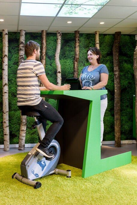Dit onderdeel, de Health2Work Bike, kan gebruikt worden als hoge tafel waar je bij fietst.