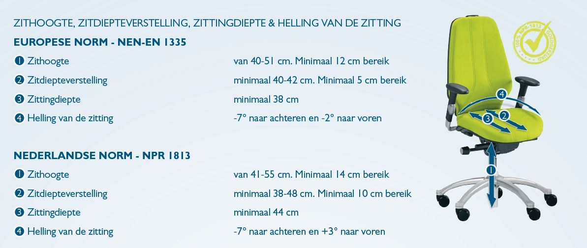 Wat is het verschil tussen de NPR-1813 en NEN-EN 1335? Het gaat hier over Nederlandse en Europese normen voor kantoorstoelen. De norm zegt iets over de maatvoering en instelbaarheid van een bureaustoel. NEN-EN 1335 is de Europese norm. Omdat de maat van Nederlanders onderling erg verschillend is, is een extra praktijkrichtlijn gemaakt; NPR-1813.