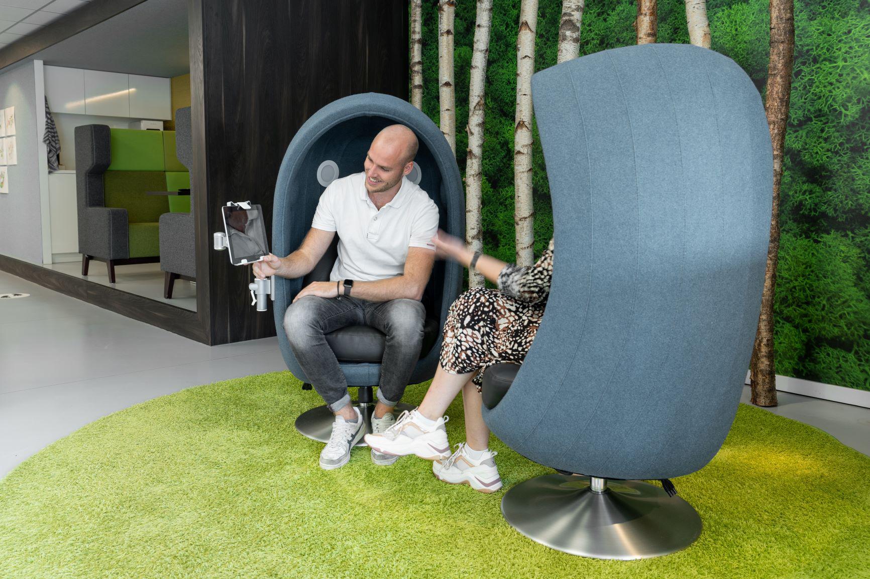 De 4-Senses akoestische stoel is een innovatieve, akoestische stoel waarmee omgevingsprikkels gereduceerd worden. Zodra je plaatsneemt in de stoel, ervaar je een veilig en geborgen gevoel doordat de stoel zich als een cocon om je heen vormt. De stoel heeft ingebouwde geluidsboxen waarmee rustgevende muziek afgespeeld kan worden. Ook heeft de stoel speciale verlichting die in allerlei kleuren afgesteld kan worden. Met de tablethouder kan een tablet aan de stoel bevestigd worden, zodat je video’s kunt afspelen. Dit alles om een ontspannen sfeer te creëren. Er zijn drie soorten tablethouders. De stoel is daarom aan iedere wens aan te passen.