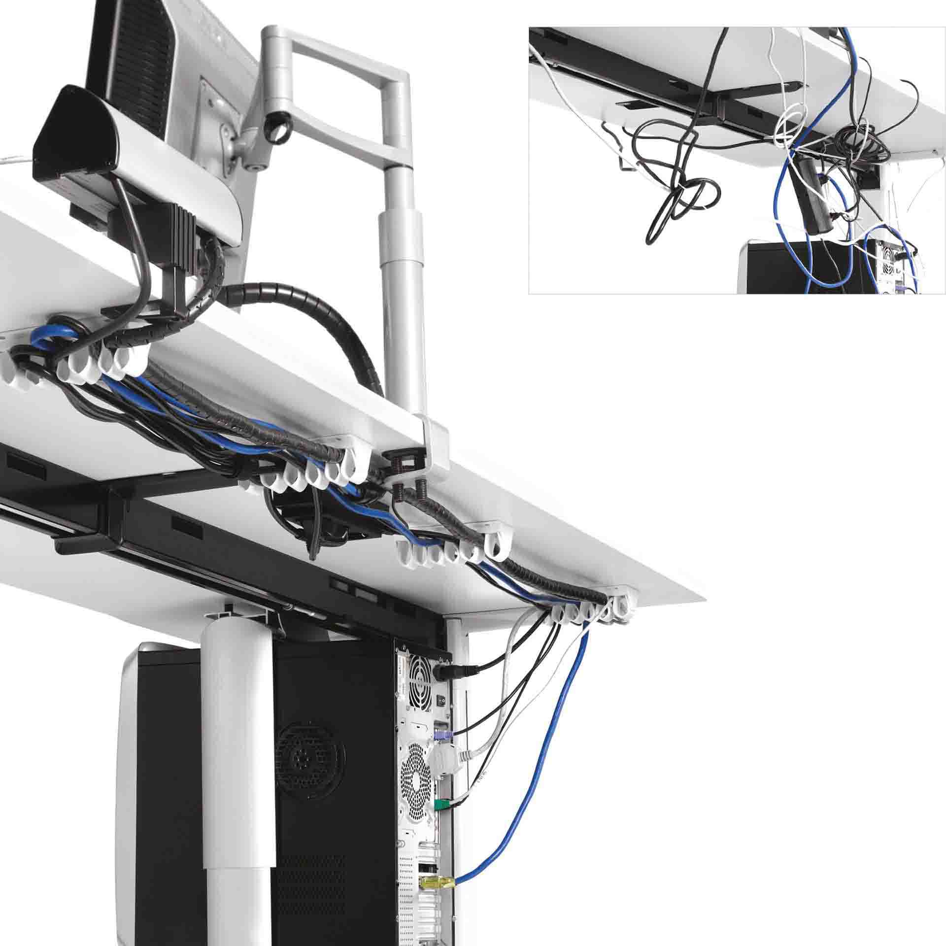 Een wirwar van kabels onder bureaus zorgt niet alleen voor de zojuist genoemde stofophopingen en kabelbreuken maar kan ook voor kortsluitingen zorgen, met ICT-storingen als gevolg. Door de kabels ‘te managen’ zorg je ervoor dat er minder stofophopingen zijn, dat de werkplekken eenvoudiger kunnen worden verhuisd en dat er een ruime beschikbaarheid van stroom- en informatievoorziening is. Het kabelmanagement van Health2Work zorgt ervoor dat de systemen die aangesloten zijn op de kabels stabieler zijn. Daarbij is de werkplek eenvoudiger schoon te maken en de opgeruimde werkplekken maken je productiever!