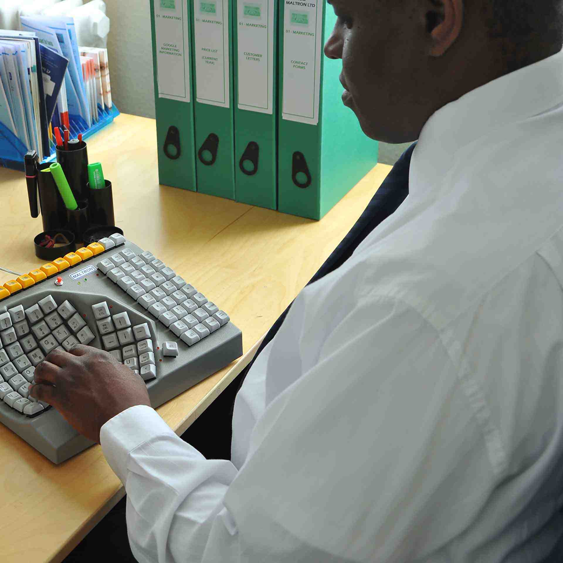 Speciaal linkshandig toetsenbord voor bediening met slechts één hand. Het Maltron toetsenbord bevat alle standaard toetsen en is zowel in een links- als rechtshandig model verkrijgbaar. Omdat de vingers in een kuil werken en het toetsenbord licht af helt, wordt overbelasting vermeden.