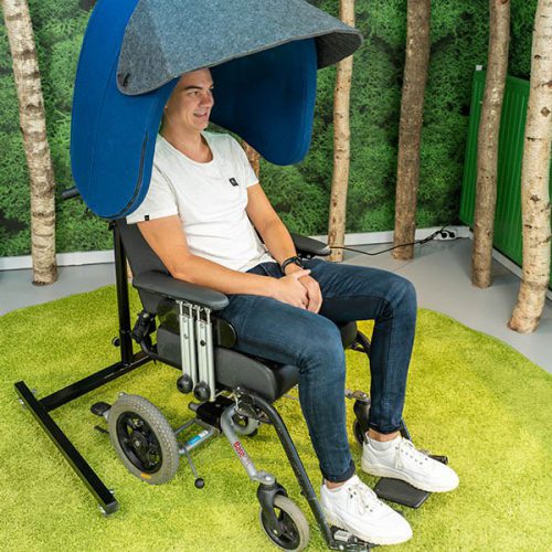 De 4-Senses Cap is een uniek product dat helpt bij het reduceren en beïnvloeden van prikkels. De Cap is een doorontwikkeling van de 4-Senses akoestische stoel. De Cap is speciaal ontworpen voor mensen in een rolstoel. Het product is geschikt voor elk type rolstoel en is makkelijk te verplaatsen. Het product is zo vormgegeven dat mensen die plaats nemen onder de Cap het gevoel hebben in een eigen bubbel te zitten en hierdoor tot rust komen. Door te kiezen uit verschillende verlichtingskleuren en het afspelen van muziek kun je de omgeving op de individuele wensen en behoeften afstemmen. Hiermee creëer je een veilige en rustige omgeving.