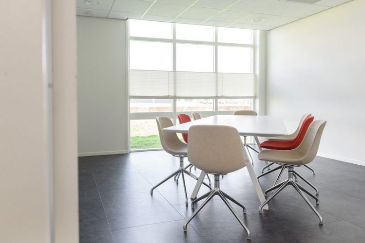 Het gehele pand is rondom voorzien van ramen van ongeveer 120 x 120 cm. Wij hebben gekozen hier plissé gordijnen in te zetten volgens het top down en bottom up systeem. De plissés kunnen geheel open of dicht, maar ook als een baan in het midden van het raam geplaatst worden met het oog op privacy. Plissé gordijnen filteren het zonlicht en voorkomen daarmee hinderlijke lichtinval op bijvoorbeeld het beeldscherm van de computer.
