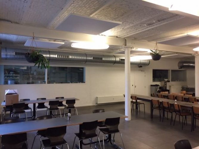Mensen komen samen in de kantine voor een hapje, een drankje en een praatje. Veel kantines of bedrijfskantines hebben een minimalistisch ontwerp en zijn afgewerkt met harde materialen. Zo ook bij De Punt. De ruimte in kwestie is groot en heeft een hoog plafond. Als er meerdere mensen tegelijk in de ruimte zijn, resulteert dat in veel lawaai en een slechte spraakverstaanbaarheid. We merkten dat het steeds minder druk werd in onze kantine. Zodra er meerdere mensen in de ruimte waren, was het te lawaaierig. De installatie van plafondpanelen heeft de akoestiek aanzienlijk verbeterd. De cafetaria wordt nu weer op volle capaciteit gebruikt,” zegt Piet Lietaer, Managing Director van De Punt.