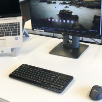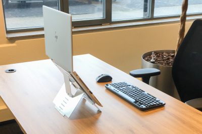Voor onze thuiswerkpakketten hebben we gebruik gemaakt van de R-Go Riser Flexible – Laptophouder, R-Go Compact Break – Toetsenbord, R-Go Zepher Circulaire enkele flatscreenarm en de R-Go Zepher Circulaire dubbele flatscreenarm.