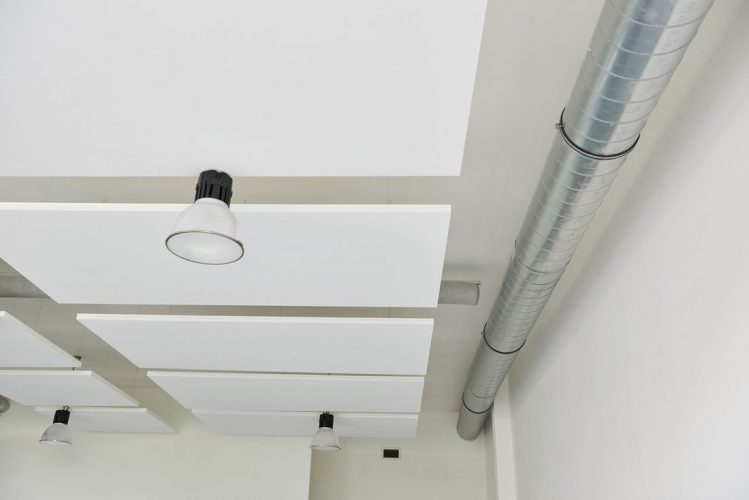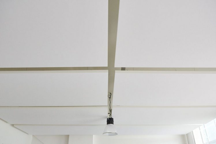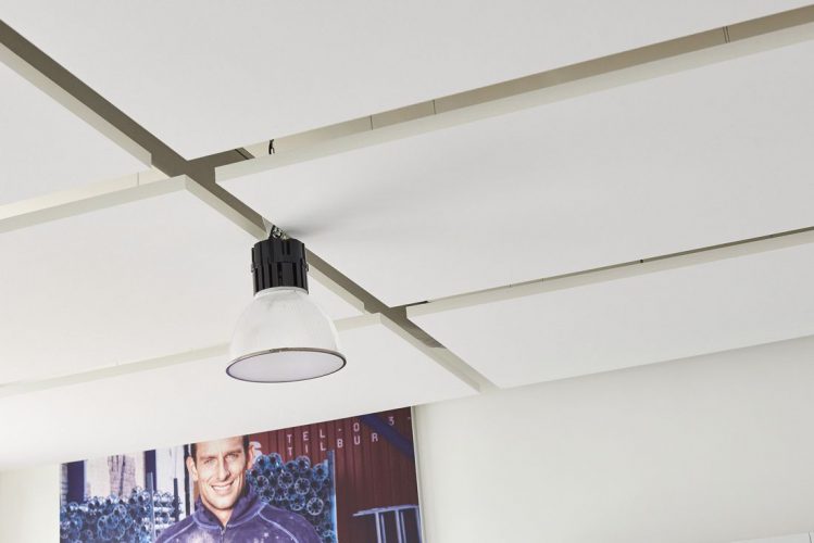 De geluidsproblematiek is opgelost door de ruimte te voorzien van witte akoestische plafondpanelen. Deze hebben we onder en naast de luchtbehandelingskanalen geplaatst, zodat het industriële karakter niet verloren gaat.