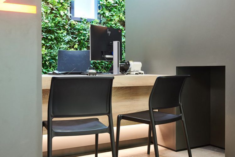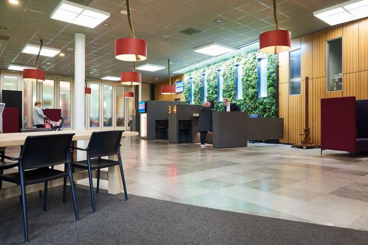 De ontvangstbalie met de verticale tuin – ook wel de Greenwall genoemd – is het hart van de ontvangstruimte. Uniek aan de balie is dat de bezoeker zelf de keuze kan maken voor een zit- of sta plek aan de balie. Daarmee is gemeente Ooststellingwerf één van de eerste gemeentes in Nederland, waar zowel de bezoeker als de medewerker de mogelijkheid heeft om aan de balie te zitten of te staan. Wij hebben dit uniek stukje maatwerk mogen leveren!
