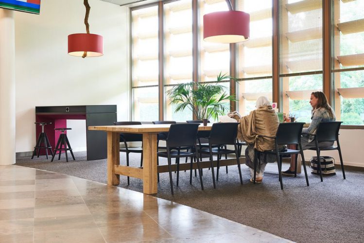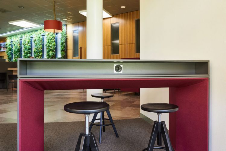 In de akoestische zitjes in de centrale hal kan de bezoeker in alle rust met de ambtenaar overleggen, zonder dat de ambtenaar daarvoor een vergaderruimte hoeft te reserveren. Even snel met je laptop of tablet zaken regelen bij de gemeente? Dat kan aan de fraaie bartafel die we hebben voorzien van de nodige aansluitingen.