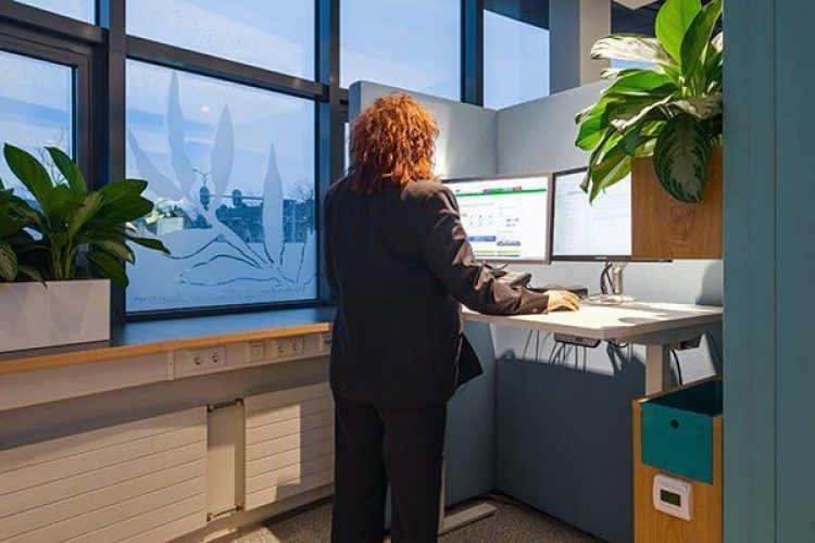 Het Klant Contact Centrum van Gemeente Rijswijk is een mooi voorbeeld van hoe een kantoor mooi én gezond ingericht kan worden. Omdat het werk voor 99% bestaat uit beeldschermwerk, was het belangrijk om de medewerkers te stimuleren om van houding te wisselen. Met op iedere werkplek een zit sta bureau wordt het eenvoudig om zittend werken af te wisselen met staand werken. De HAG Sofi bureaustoel en de Swopper zorgen ervoor dat de medewerkers van Gemeente Rijswijk ook zittend in beweging blijven. Doordat er continu van houding wordt gewisseld, blijven spieren actief en neemt de stabiliteit in de rug toe. De nieuwe meubels zorgen er dus voor dat de gezondheid van de medewerkers bevorderd wordt!