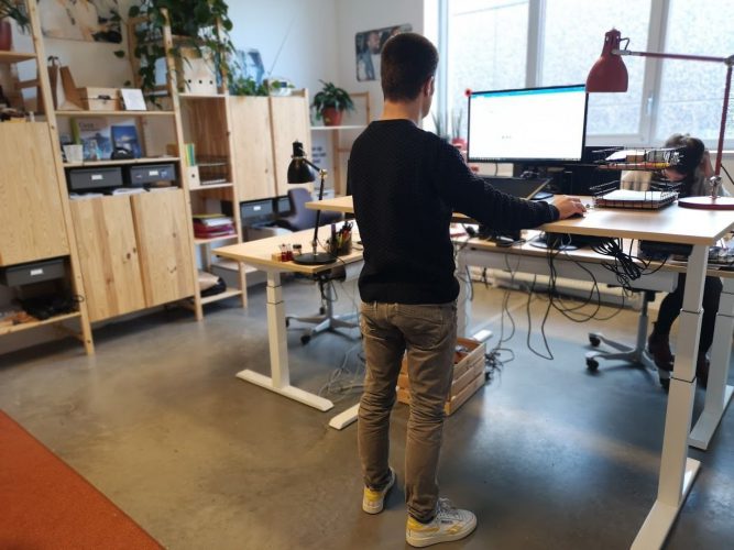 Naast bureaustoelen zijn er ook meteen zit sta bureaus aangeschaft. Een zit sta bureau biedt de medewerkers de mogelijkheid om staand te werken en te variëren in werkhouding. Er is gekozen voor een Erodesk E2T zit sta bureau. Dit bureau is elektrisch verstelbaar zodat je makkelijk zittend en staand je werkt kunt doen.