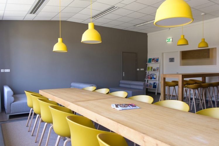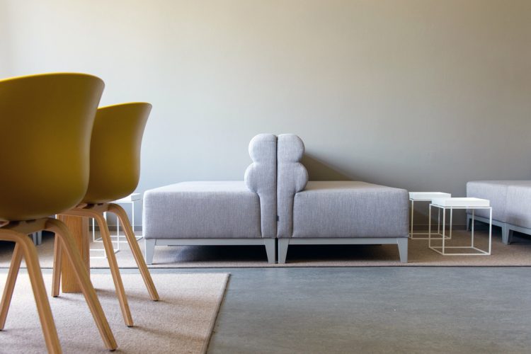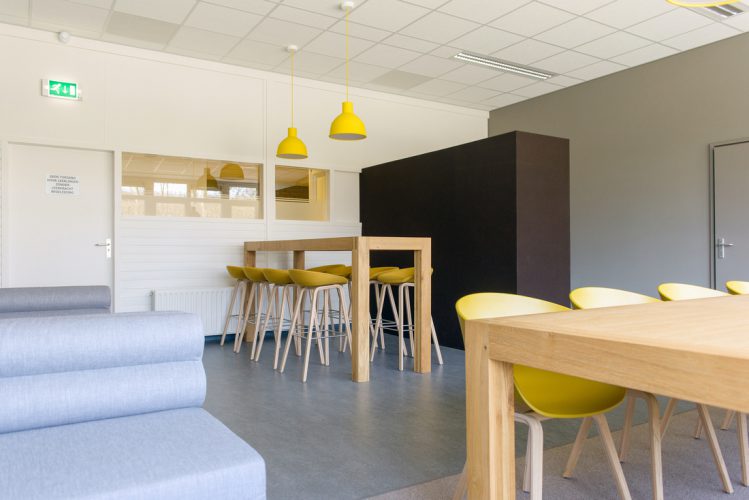 Het werken met deze jonge doelgroep is zeer intensief en vergt veel energie. Het is prettig om je dan even terug te kunnen trekken en comfortabel onderuit te kunnen zakken op één va de loungebanken. Deze banken zijn de blikvanger in de ruimte. Ze hebben een speelse vorm en een opvallende kleur. Om een boek of een kop koffie kwijt te kunnen, zijn gemakkelijk te verplaatsen salontafeltjes bij de banken geplaatst.