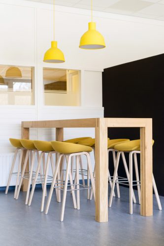 Aan de hoge bartafel kunnen medewerkers onder het genot van een kopje koffie even bijpraten, de dag doornemen en de weekplanning doorspreken. De lampen zorgen voor een informele sfeer van een kroeg of bar. Medewerkers kunnen aan deze hoge tafel zitten, maar ook staan.