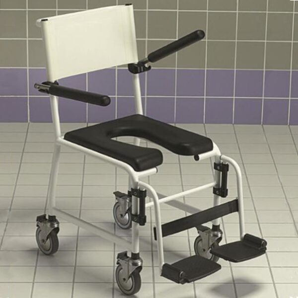 De Revato R7712 is een degelijke douche- en toiletstoel met opklapbare armleuningen en voetsteunen.