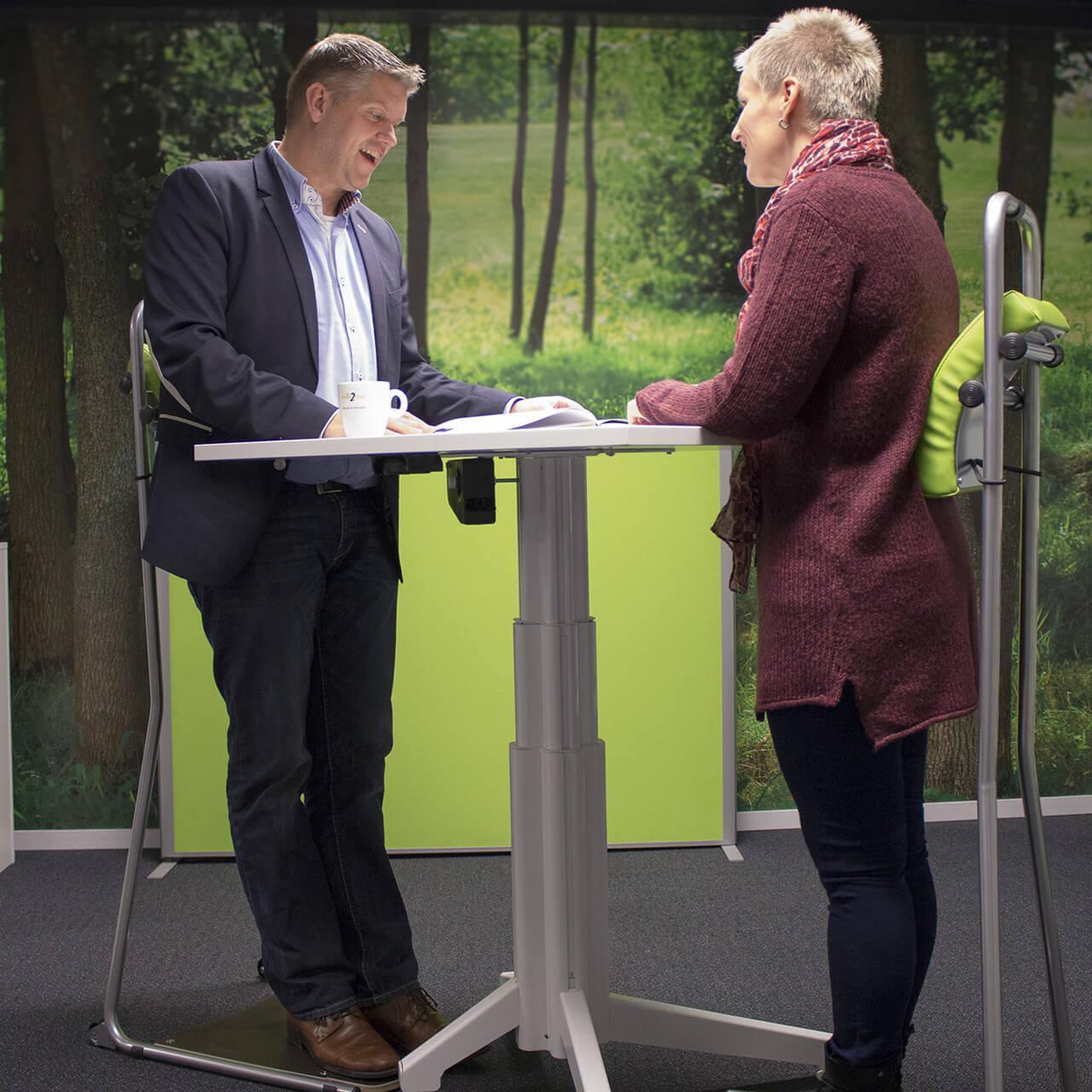 Comfortabel staand werken of vergaderen met rugsteun met de Stand2Work stahulp.